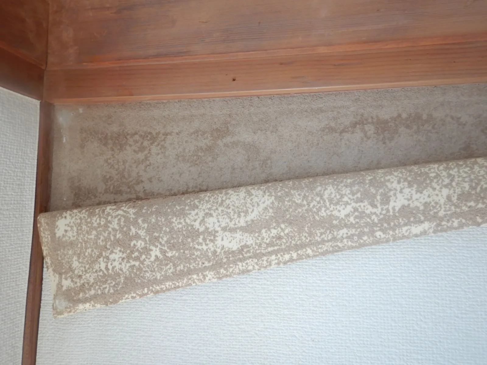 砂壁に接着剤を塗り壁紙を張った結果、わずか3年ほどで再発し壁紙が剥がれることに。