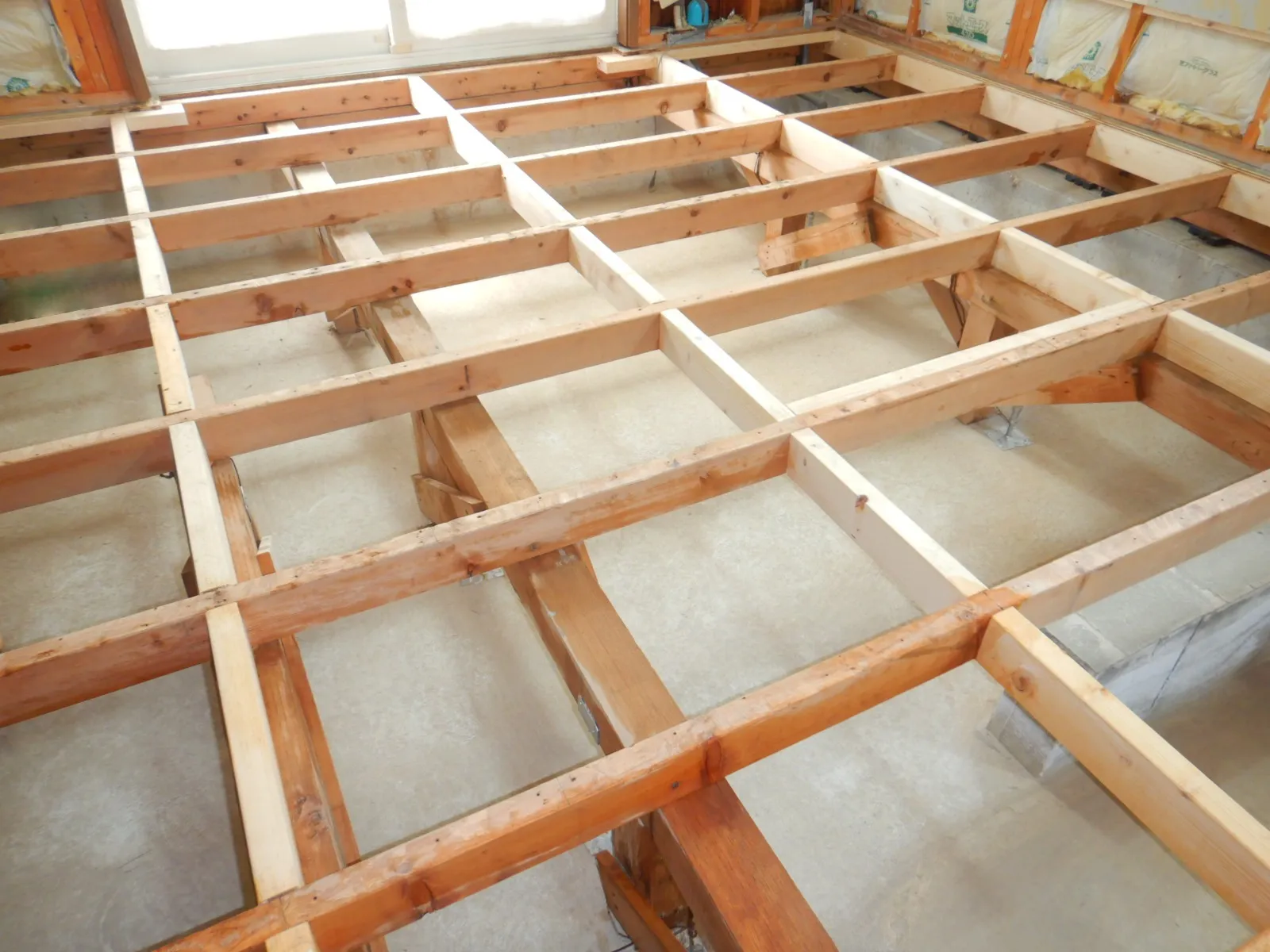 📷写真は、荒床を解体して大引きや根太・土台や束柱に防カビ工事を施しています。