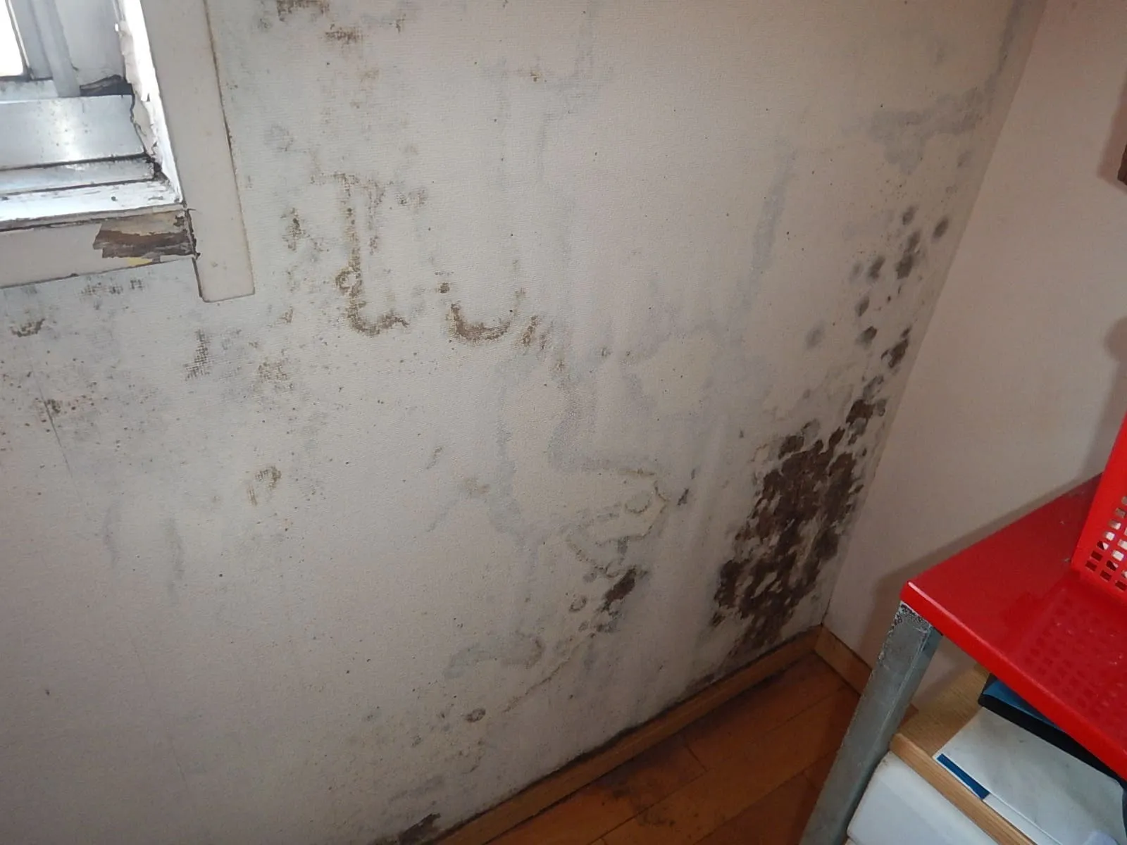 📷写真は、外壁面の壁紙下にまで臭いが浸透し、結露水の滞留で固定化した例。