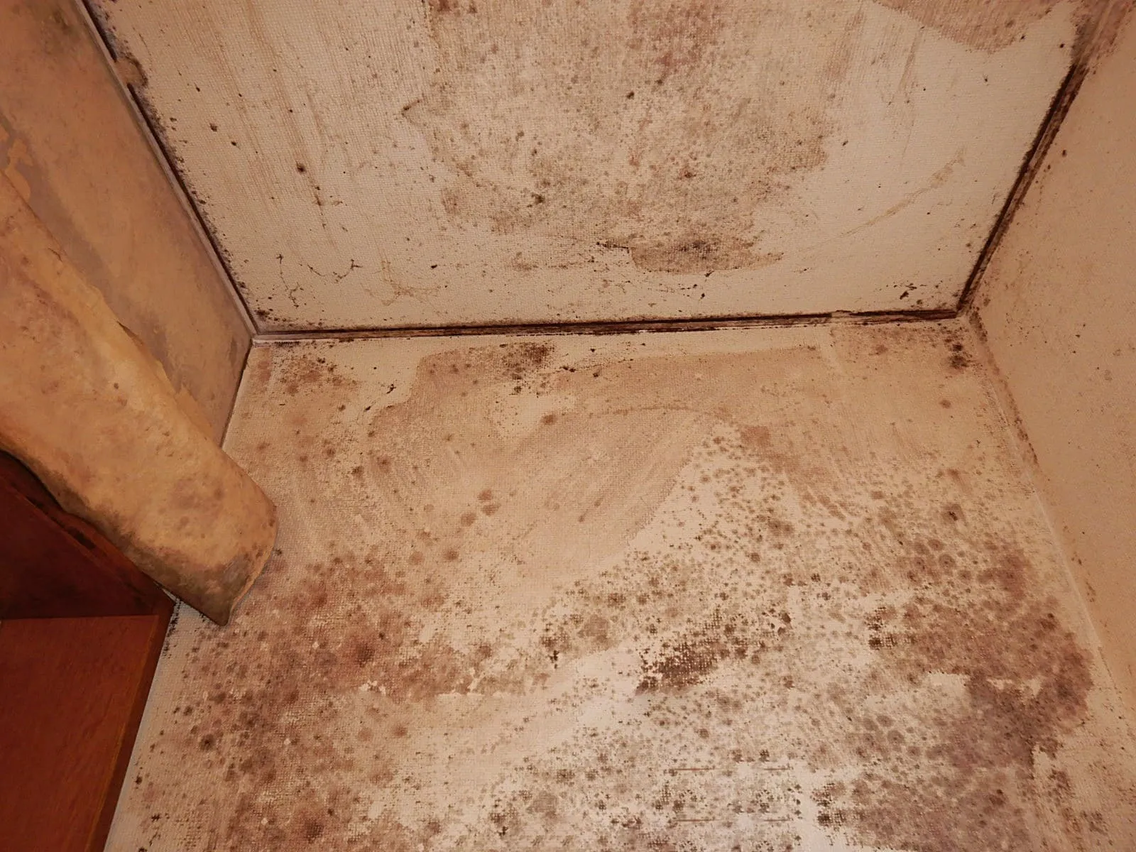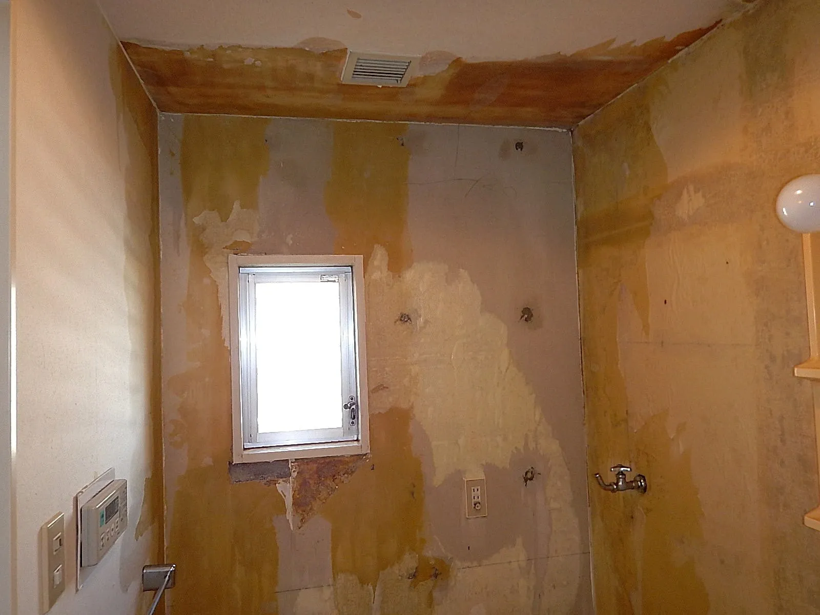 浴室ドア開放+換気不足で壁紙の裏までカビが進行し、防カビ工事で下地まで処理する必要がありました。
