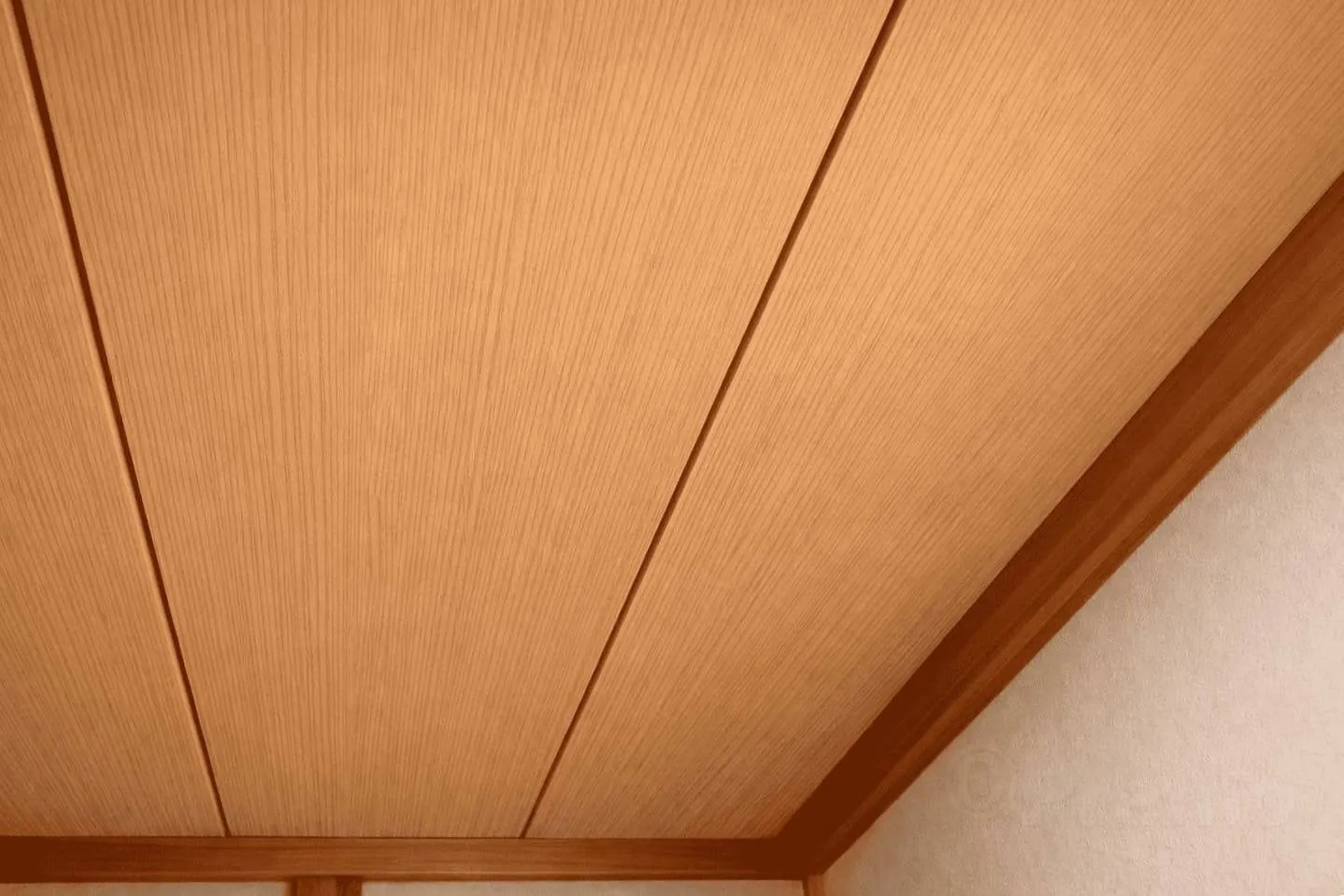 杉柾柄の化粧板を使った合板天井であることが多く、