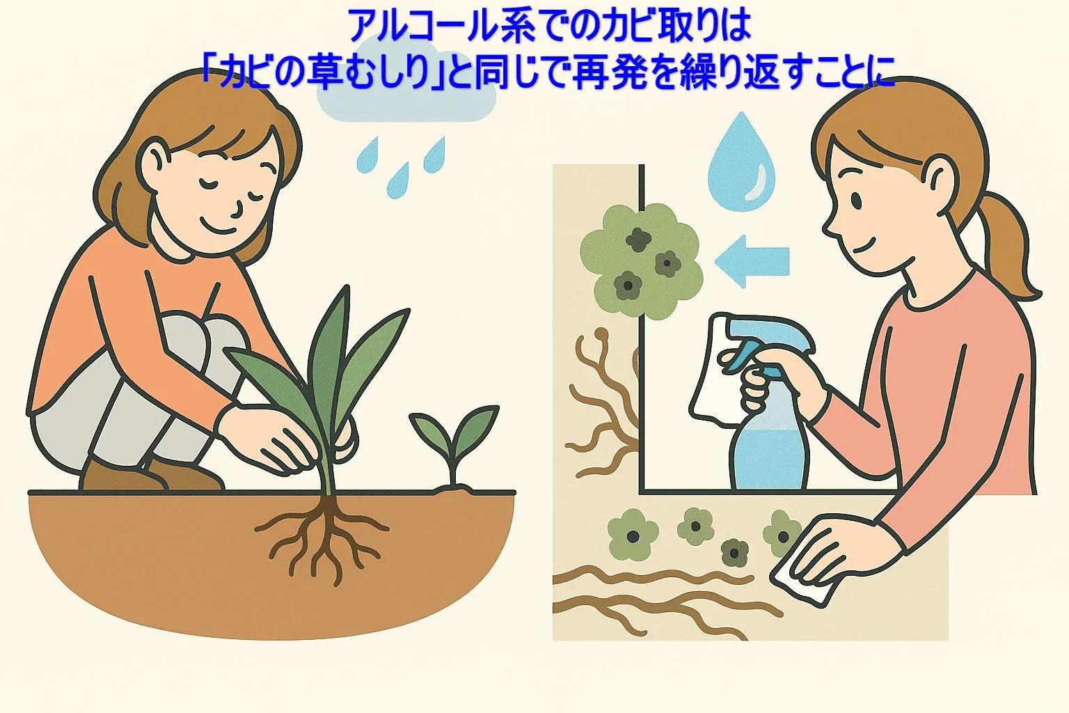 画像は、アルコール系のカビ取りと草むしりが同じ原理であることを書いています。