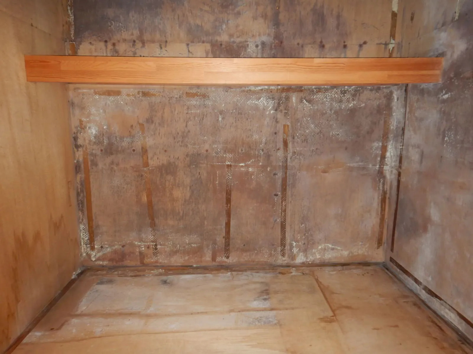 おむつを剥がすと、ベニア全面に広がったカビ。