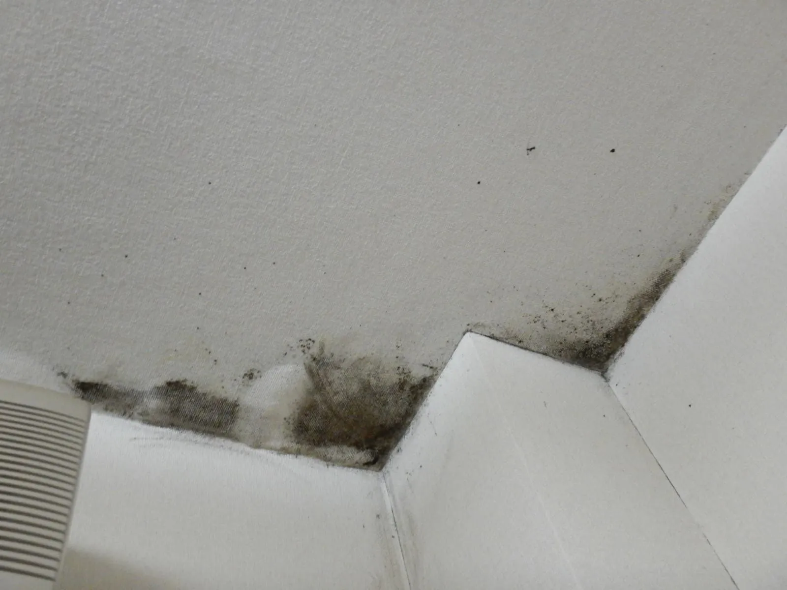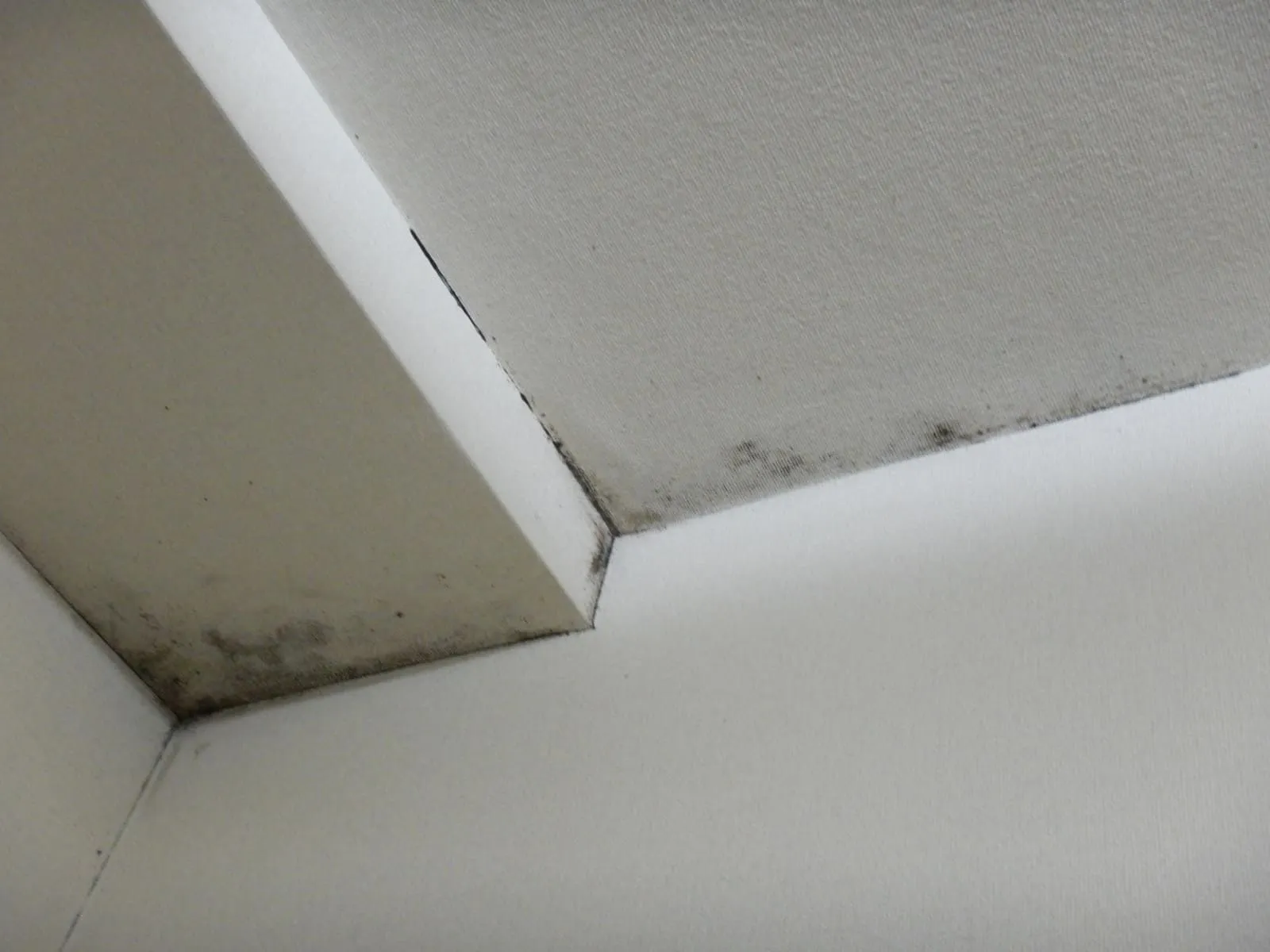 角部屋の天井隅のコンクリート直張り壁紙黒カビです。