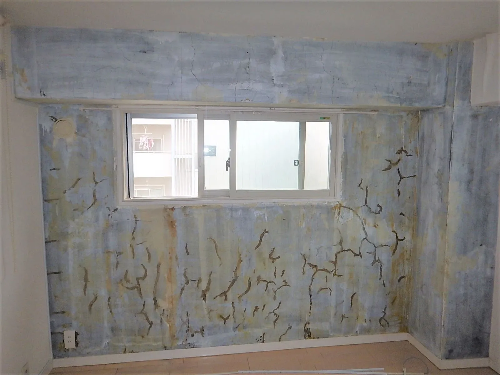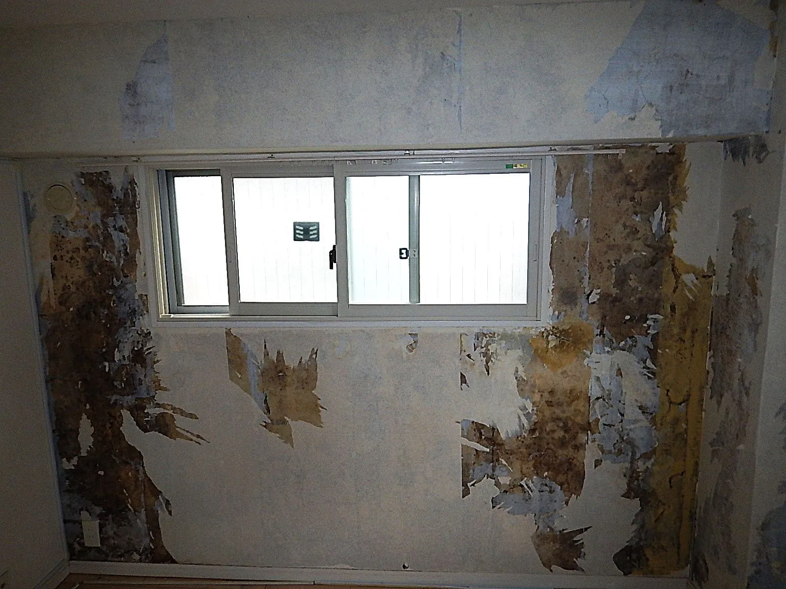 腰窓結露による、腰窓下壁(石膏ボード下地)からのカビ。