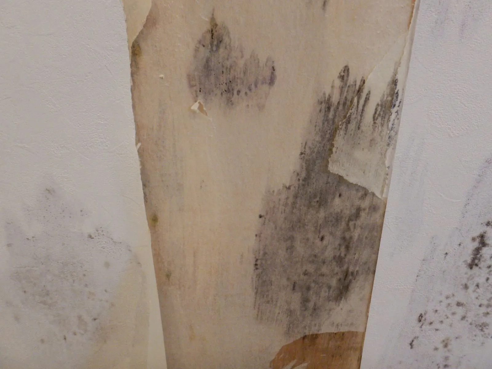 📷写真は、壁紙を剥がすと、下地の合板にもカビが広がっていました。