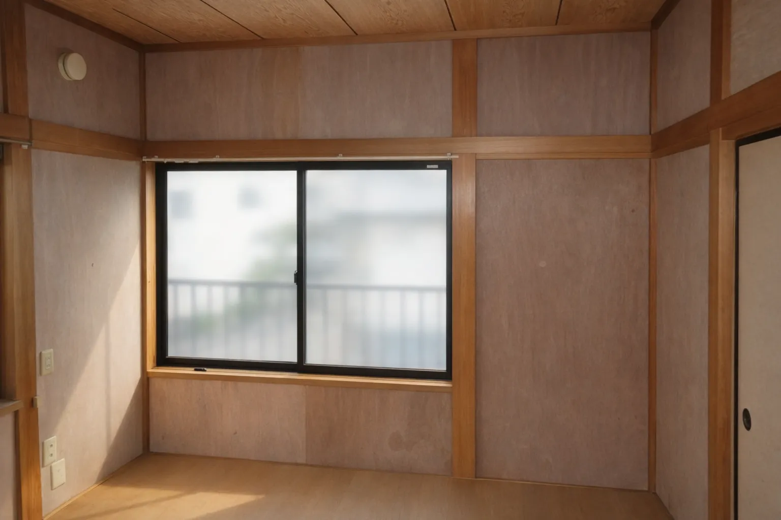砂壁掻き落とし後、防カビ工事し、ベニア貼りを実施。