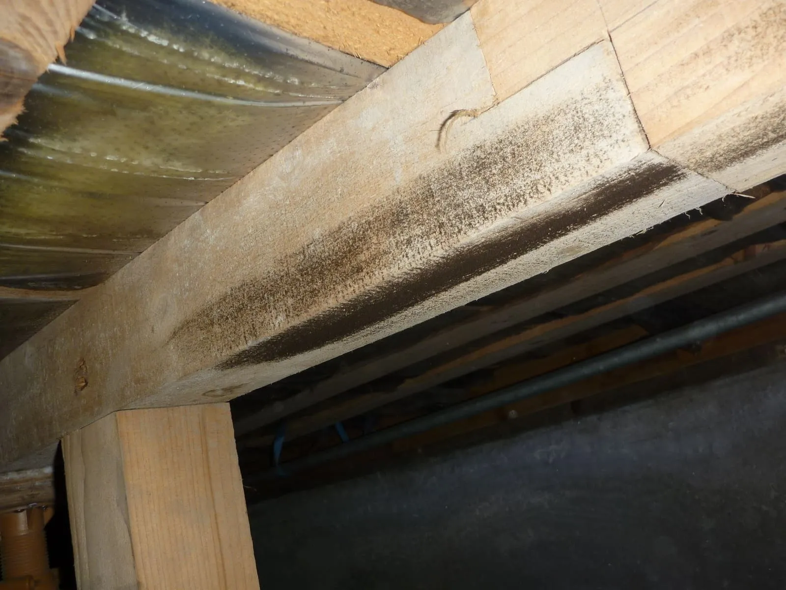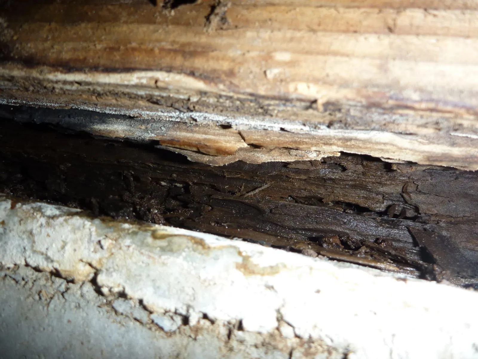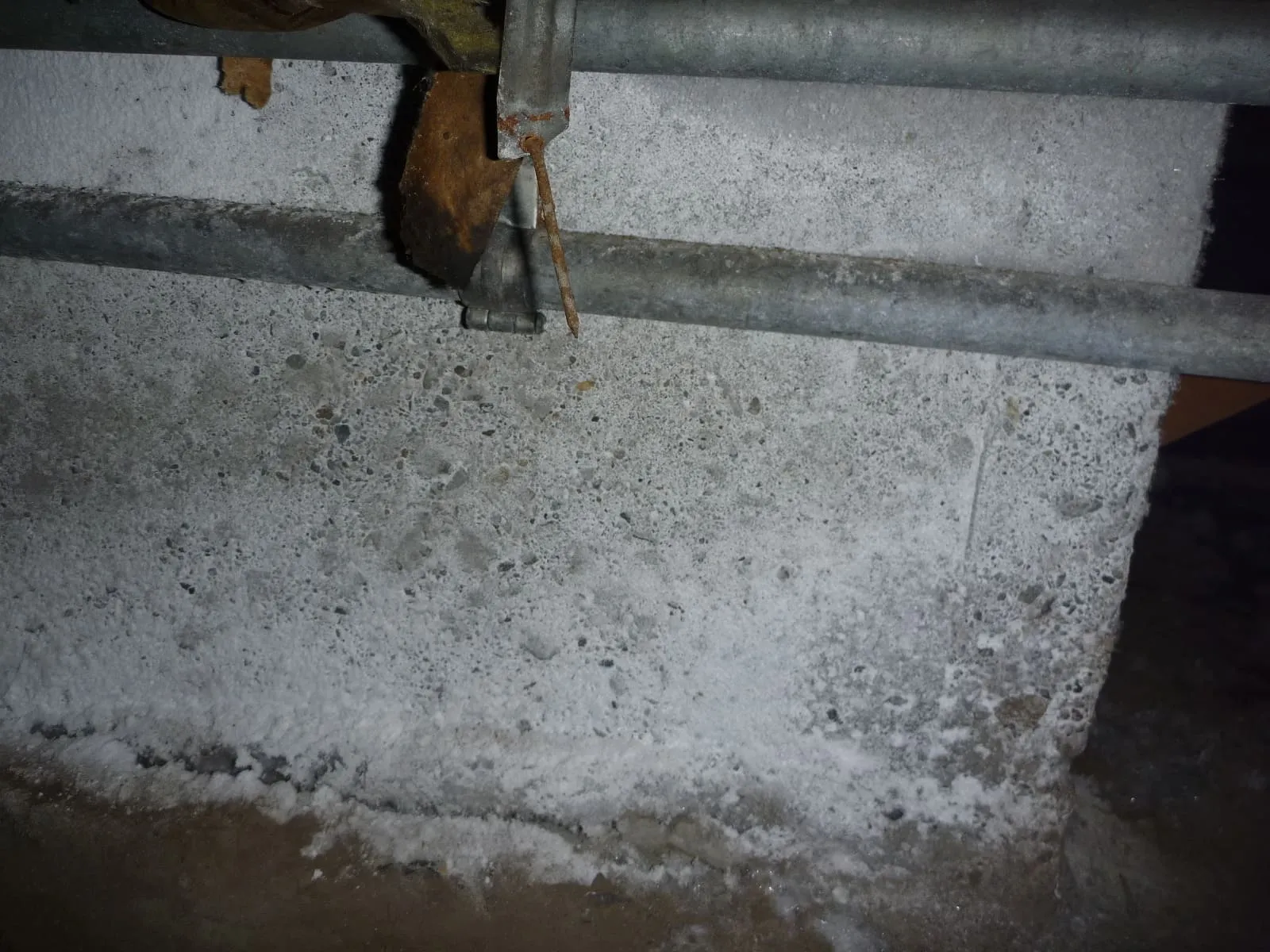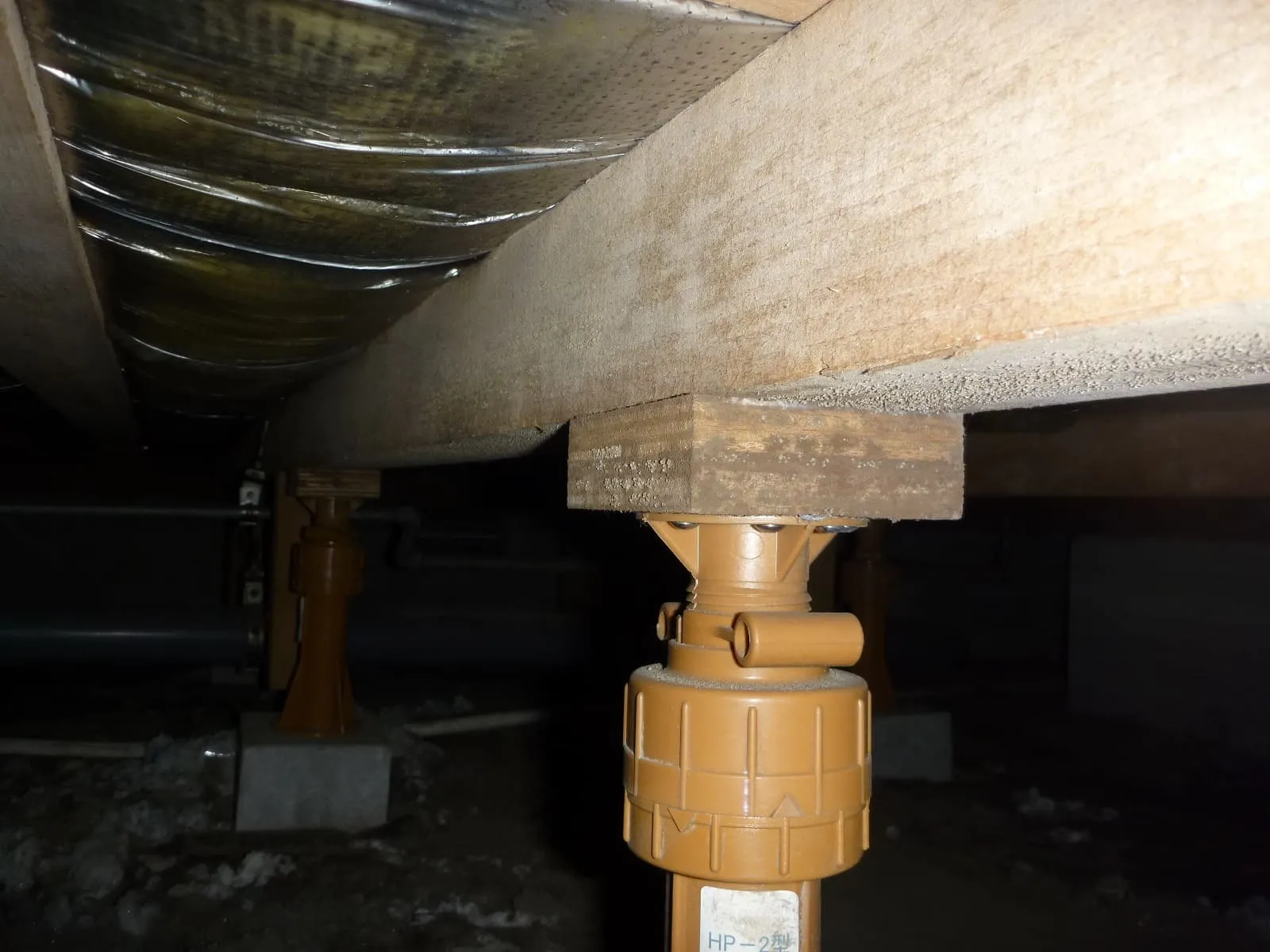 針状結晶によるコンクリートの劣化が進行した結果、床下の湿度が上昇し、木部にまで真菌が繁殖。