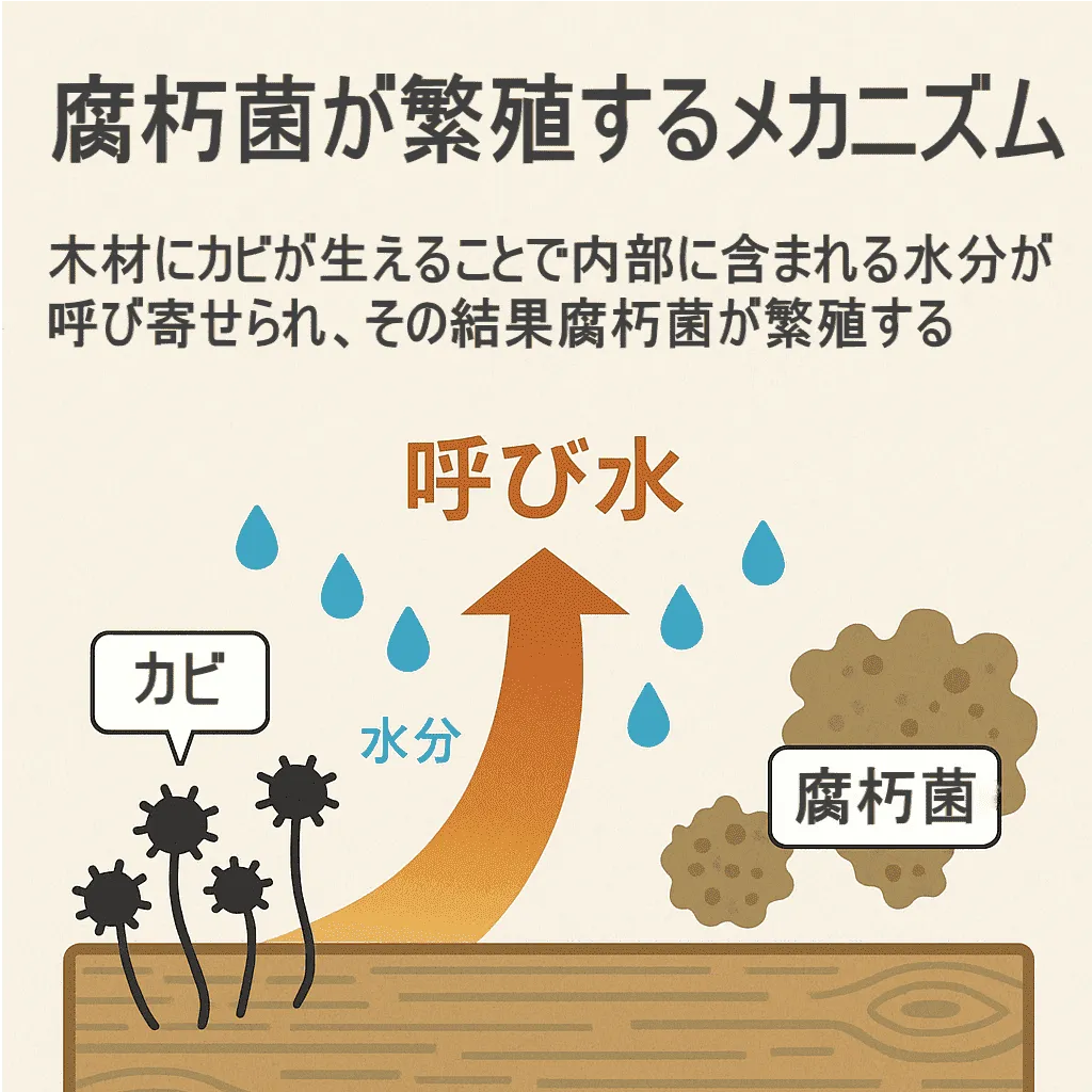 📷 図解:「カビが繁殖 → 木材内部の水分増加 → 腐朽菌が繁殖」