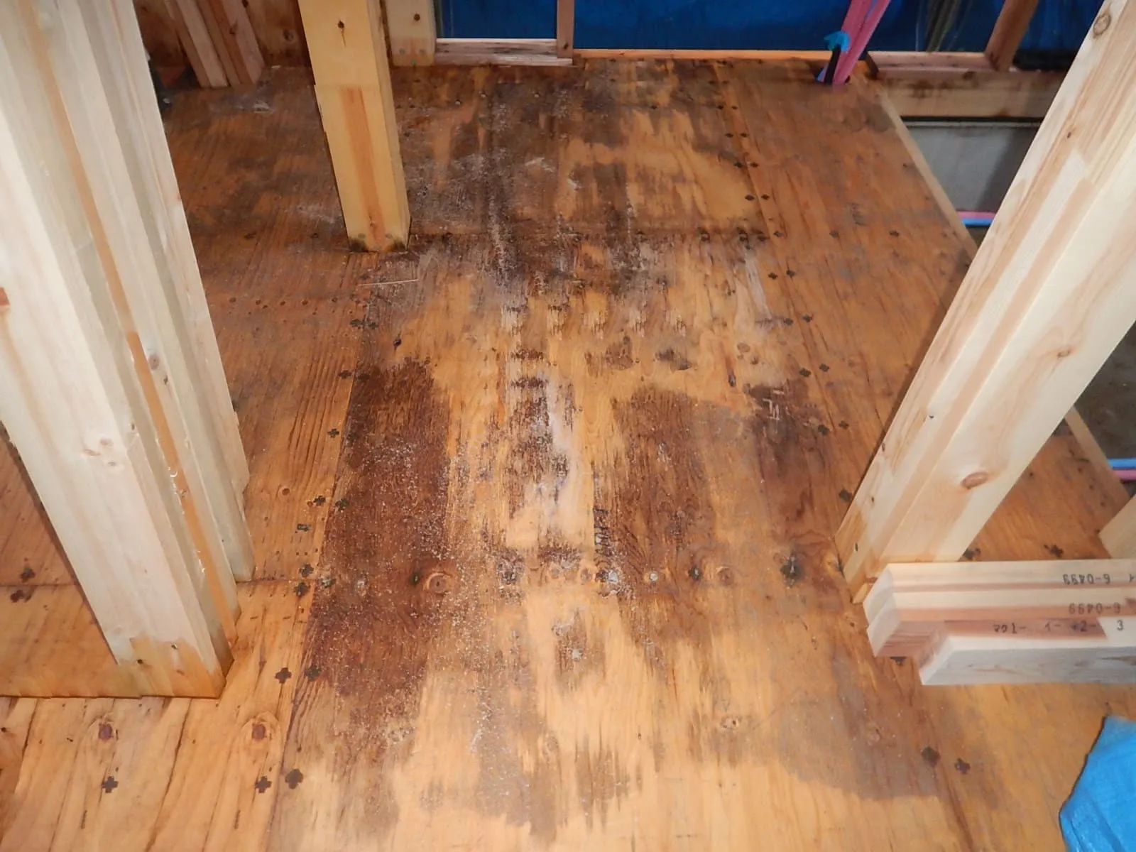 このまま放置してフローリング材を貼ってはいけませんが、中には灰汁やカビを無視してそのまま貼るような業者もいますので、施主様はご自身の眼で確認・判断する必要があるでしょう。