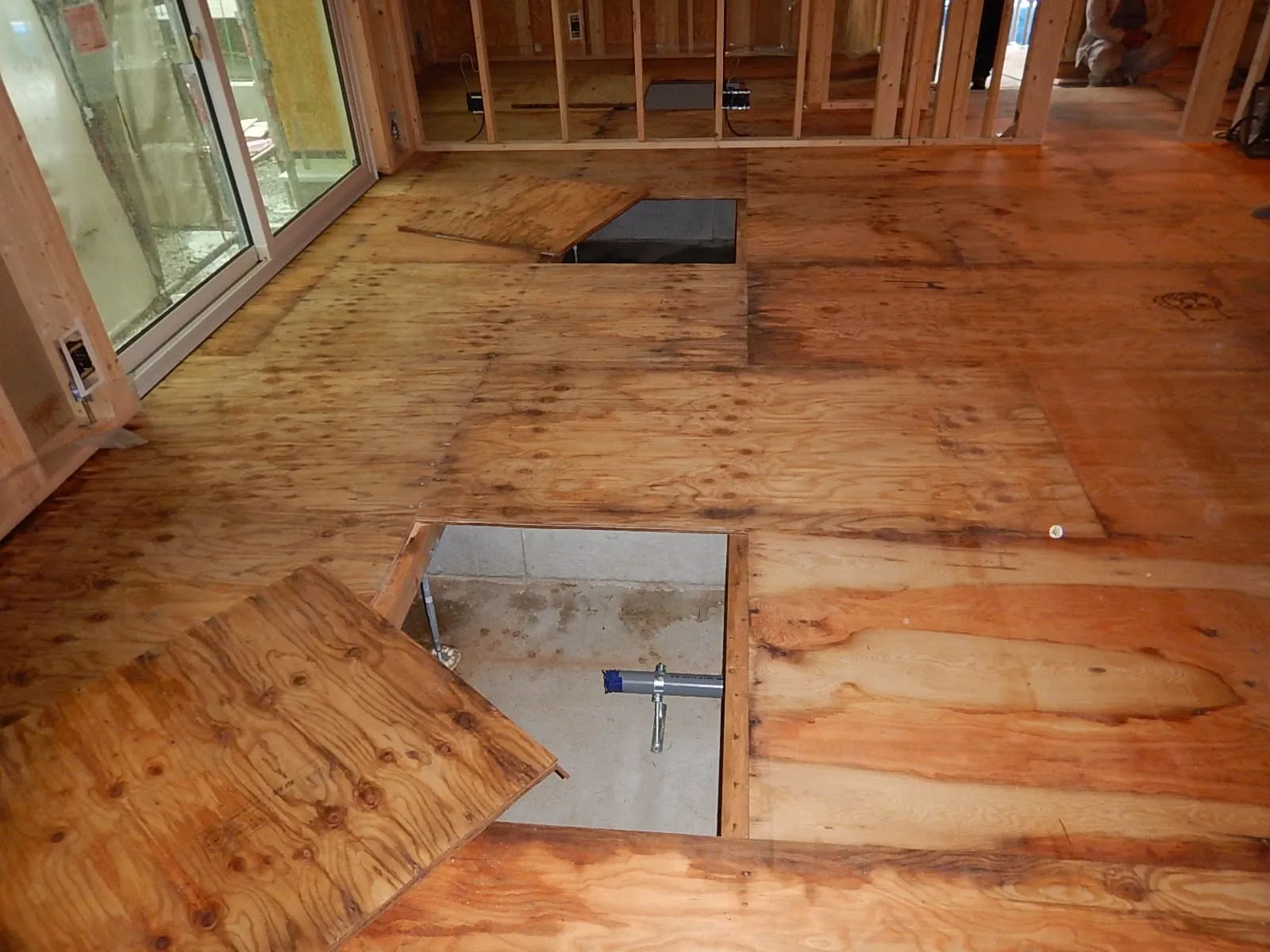 📷写真は、雨に濡れた構造用合板と床下を乾燥させるために合板をアットランダムに剥がしたところ。