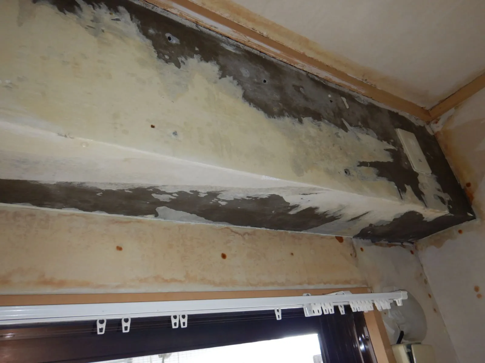 📷写真は、コンクリート梁直張り壁紙で、梁の下側に結露水で黒カビが発生している状態。