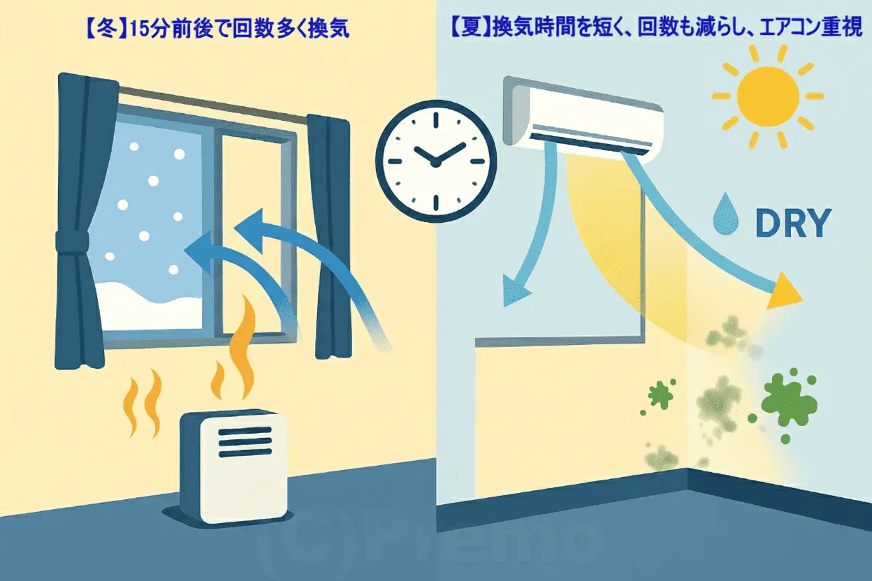 ・冬:15分前後の換気を1日数回。外気を入れて温度差を小さく。