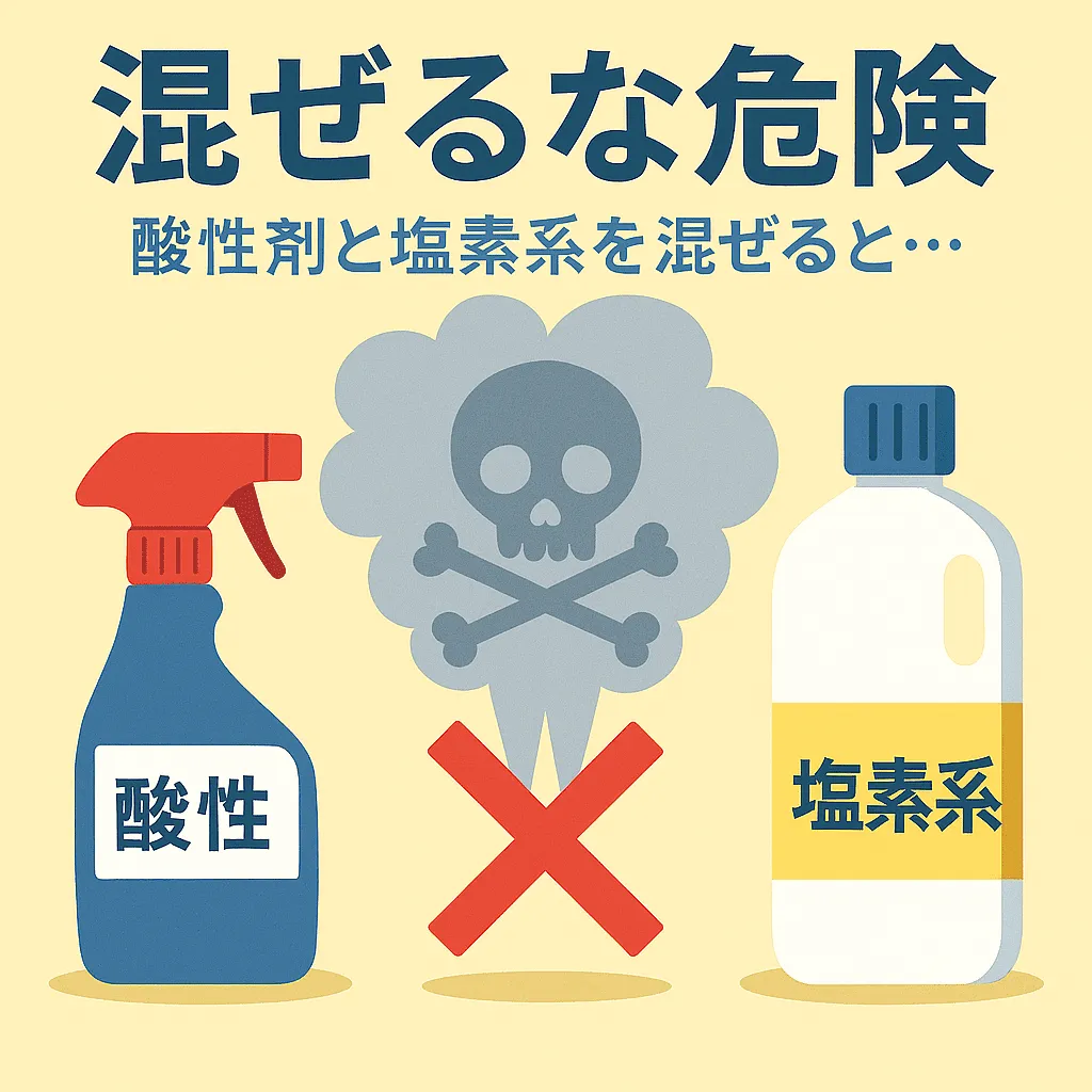 強アルカリ性(pH10以上)+酸性(pH2以下)=塩素ガス発生!