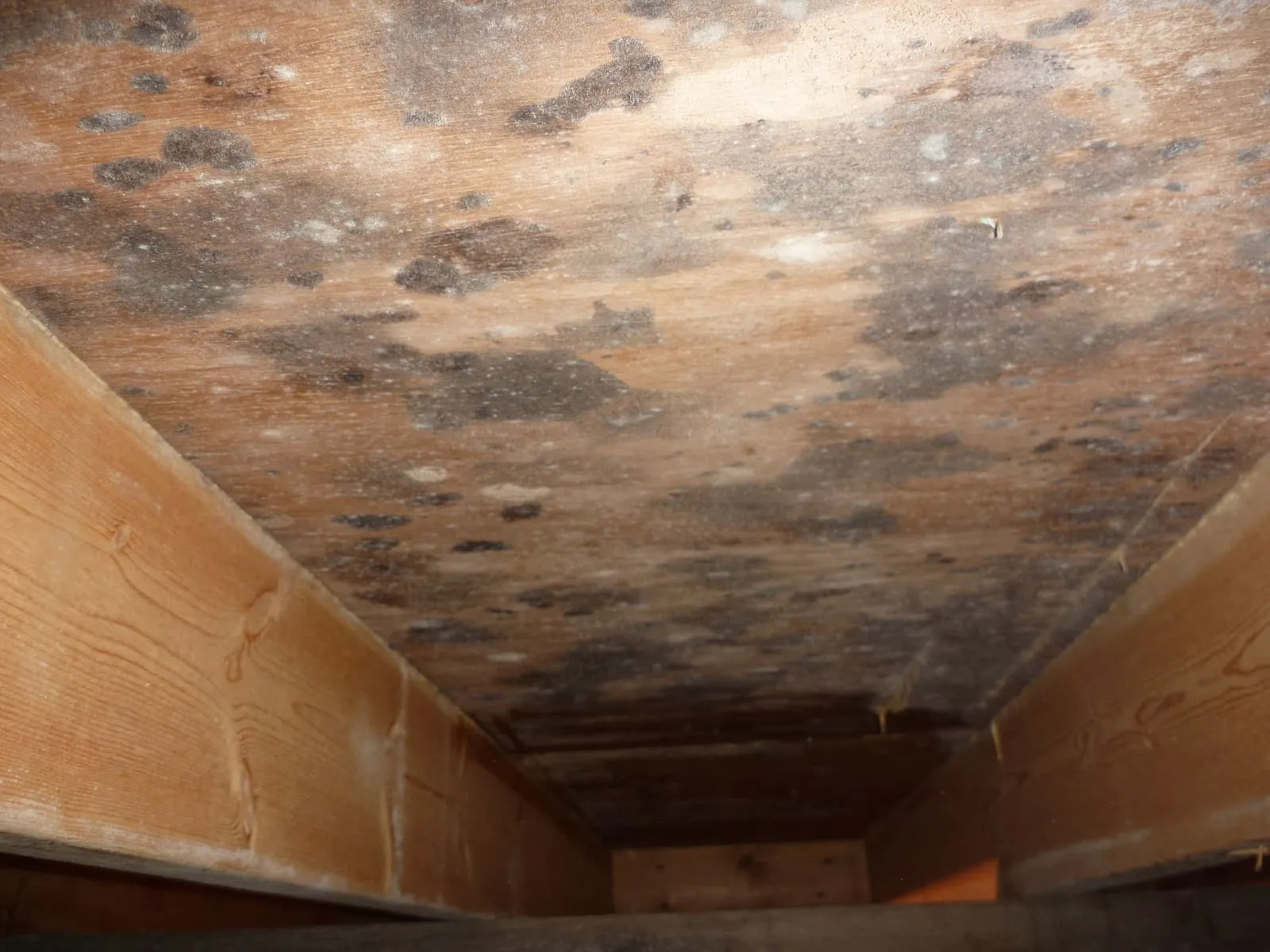 黒カビが合板や根太に広がり、放置すれば構造材内部へと深く侵食していく状況でした。